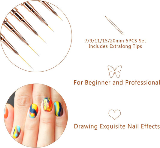 5PCS Nail Art Liner Brushes Long Set with Lid and Diamand Handle 7/9/11/15/20Mm, Fine Detail Painting Cap Pens Kit Thin Acrylic Line Brush Tools for DIY Professional Design Rose Gold