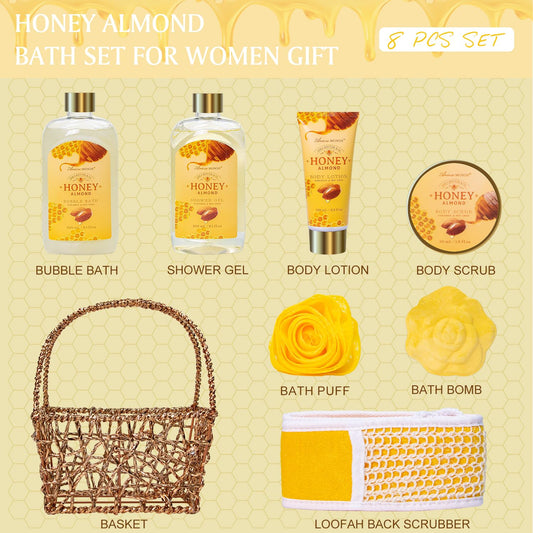Gift Baskets for Women, Spa Gifts for Women, 8Pcs Honey Almond Bath Gift Set for Women, Relaxation Self Care Spa Kit W/Bath Bomb, Bubble Bath, Mom Birthday Gifts, Christmas Gifts Thank You Gifts